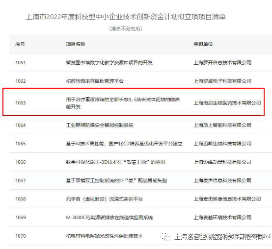 近期,上海市科学技术委员会组织的“上海市2022年度科技型中小企业技术创新资金计划”拟立项项目名单公示完毕,金年会jinnian生物“用于治疗重度哮喘的全新长效IL-5纳米抗体药物的临床前开发”项目入围。